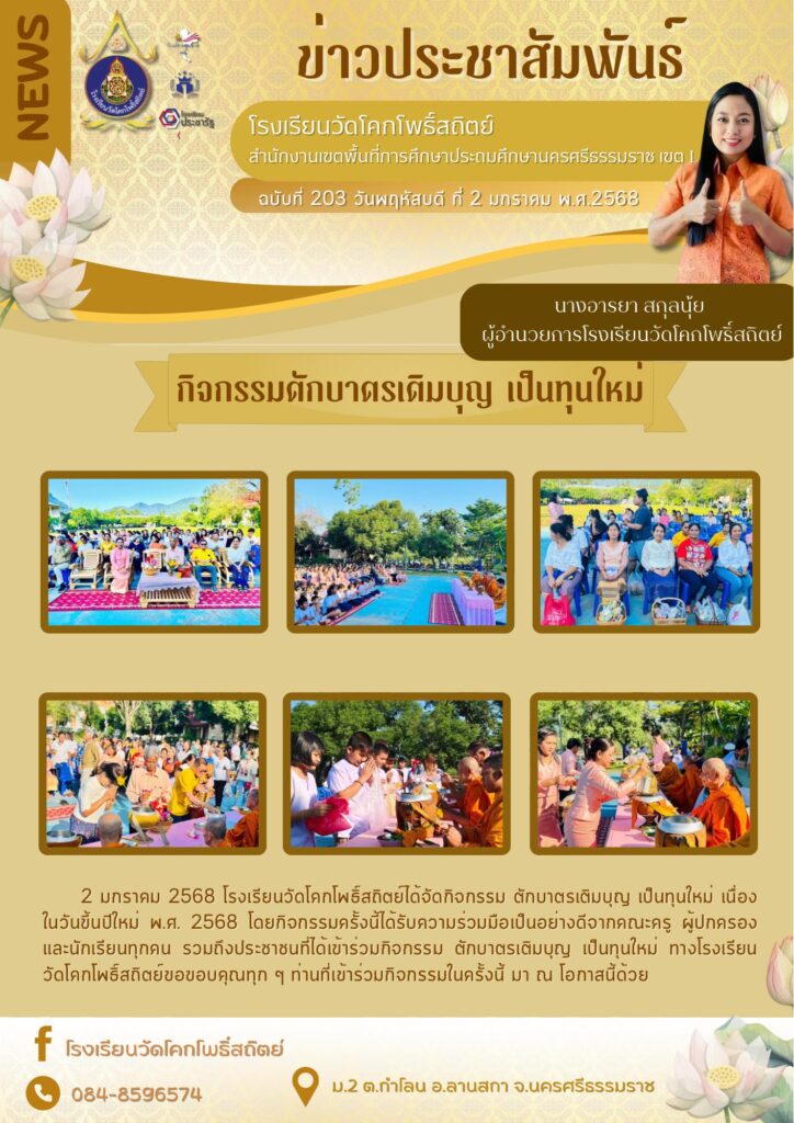 “สวัสดีวันปีใหม่ ปี 2568” โรงเรียนวัดโคกโพธิ์สถิตย์ ได้มีการจัดกิจกรรมเริ่มต้นปีพ.ศ. 2568 ด้วยการตักบาตร เติมบุญเป็นทุนใหม่ เพื่อเป็นศิริมงคลในวันขึ้นปีใหม่ ปี 2568 โดยกิจกรรมในครั้งนี้ได้รับความร่วมมือเป็นอย่างดีจากคณะครู ผู้ปกครอง และนักเรียนทุกคน รวมถึงประชาชนที่ได้เข้าร่วมกิจกรรมในครั้งนี้ด้วย ทางโรงเรียนวัดโคกโพธิ์สถิตย์ขอให้ทุกท่านมีความสุขตลอดปีและตลอดไป